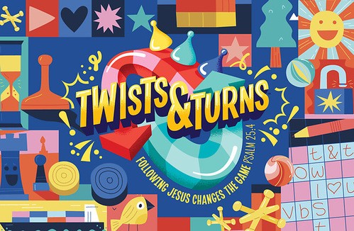 Twists & Turns is a fantastical celebration of games of all kinds. From classic tabletop games to video games and more, kids will play their way through VBS while learning that Jesus guides them through all the twists and turns of their lives. They'll find that even when they mess up it's never “game over.”